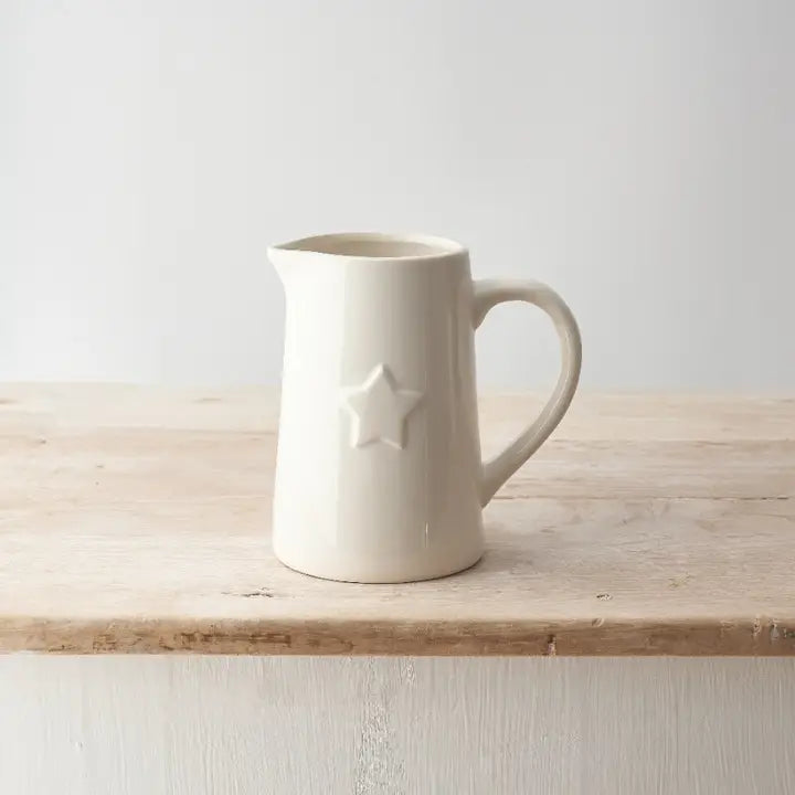 We say... This beautiful white jug is perfect for either displaying a floral arrangement, kitchen use or as a stand alone, decorative piece. The white, shiny glazed colouring is perfectly finished with a star embossed on the front creating a neutral country look.